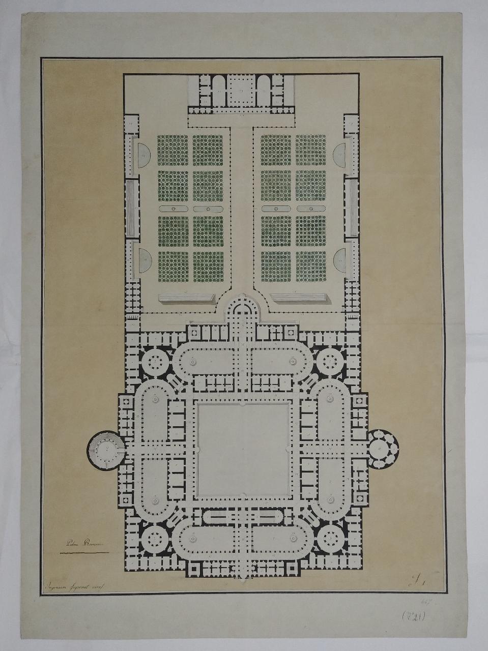 Progetto di palazzo reale a china, bistro e acquerello giallo e verde con tracce di matita. Linee di sezione a china rossa su fondo giallo entro doppia linea di margine a china e bordo chiaro. Pianta quadrangolare simmetrica con giardino retrostante, con due corpi circolari a destra e sinistra al centro a due livelli diversi con serie di vani e cortili quadrangolari ed elittici.
