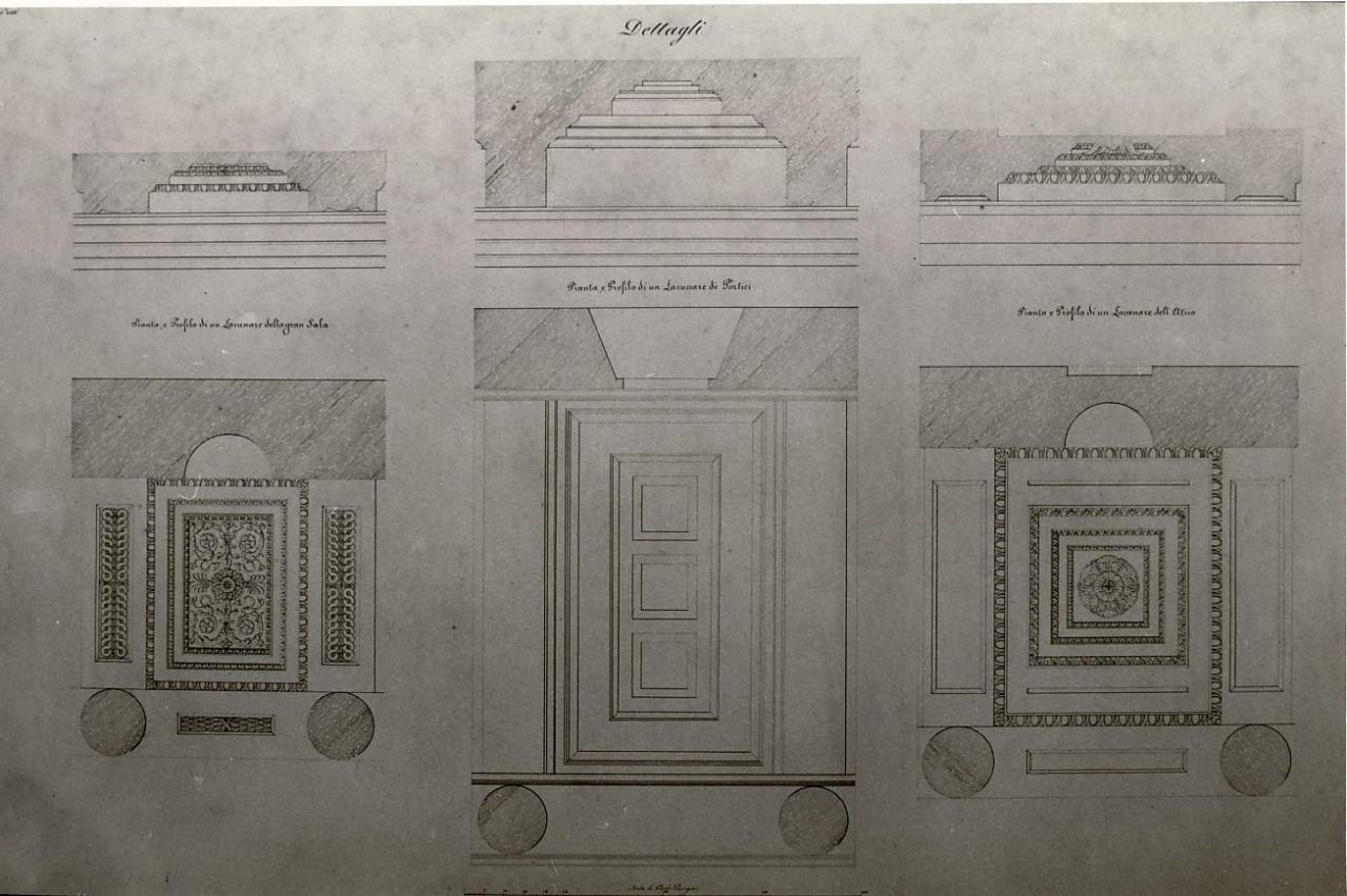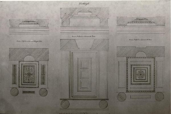 Serie di vedute dal basso verso l'alto e profili dei lacunari, a china a tratteggio rosa, su fondo chiaro, entro linea di margine a china. Sin.: veduta dal basso, con sezioni delle colonne tratteggiate di rosa, e sezione di un lacunare della grande sala. Centro: veduta dal basso e sezione di un lacunare dei portici. Ds.: veduta dal basso e sezione di un lacunare dall'atrio.