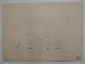 Pianta di casa di cura a matita su fondo chiaro con segnalazioni scritte inerenti alle funzioni dei vari ambienti a matita. Pianta quadrangolare di edificio con cortile centrale porticato e cappella absidata posteriore. Prospetto compreso in un corpo di fabbrica più ampio. Ingresso preceduto da gradinata e portico con cinque colonne.