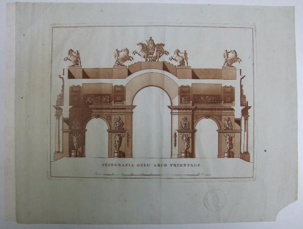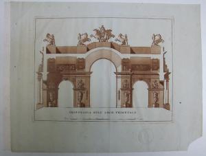 Sezione dell'arco trionfale a stampa color seppia su fondo bianco. Vista del vano centrale con 3 archi di cui i laterali minori. Sui piedritti piedistalli circolari sorreggenti statue recanti corone. Sull'intradosso dell'arco centrale fasci littori. Superiormente trofei militari. Vista della sezione dei lacunari delle volte cassettonate dei 4 archi trasversali e sezioni delle murature di congiunzione. Superirm. attico con gruppi csultorei. Al centro biga trainata da quattro cavalli.