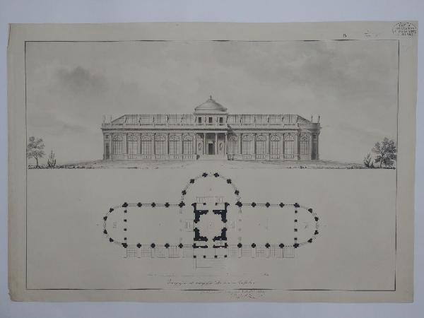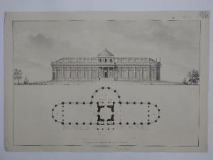 In alto prospetto di edificio a china e bistro con ombreggiature più scure tetto e finestre in acquerello azzurro su fondo campito a bistro. Edificio a 2 piani con pronao corinzio preceduto da scalini tetrastilo al centro, porta di ingresso rettangolare e lat. necchie con statue, sup. sempre nella parte centrale terrazza con balaustra 3 porte finestre rett., cop. a cupola ribassata. Lat. corpi absidati con finestra ad arco entro colonne corinzie e sup. la balaustra ornata da statua e cop. a padiglione in ferro e vetro. Sullo sfonod paesaggio naturale con alberi. In basso, pianta di edificio con murature campite in china nera e apertura in bistro all'int. dei vani num. di riferim. a legende all.a al disegno. Ed. simm. di forma rett. con absidi semicircolari sui lati, pronao d'ingresso sul lato inf., e corpo aggettante semicirc. al centro del lato sup.