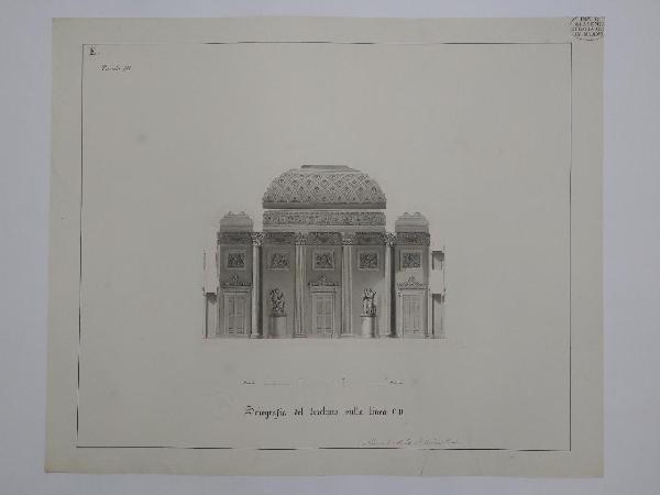 SEzione di edificio a china e bistro con murature sezionate campite in acquerello rosa e ombreggiature più scure. Salone simmetrico con vano centrale più alto e coperto a volta cassettonata a 2 vani laterali divisi da colonna corinzia con coppia piana. Al centro a lesene scanalate e una porta rettangolare, ai lati 2 porte rettangolari. In alto 5 riquadri a bassorilievo. Cornice a festoni.