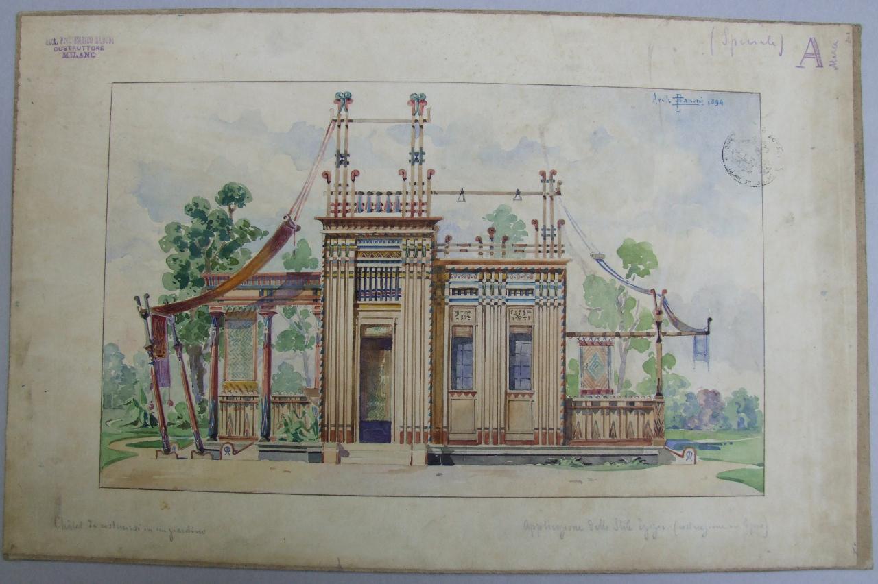 Chalet da costruirsi in un giardino (Stile egizio. Prospetto frontale). chalet