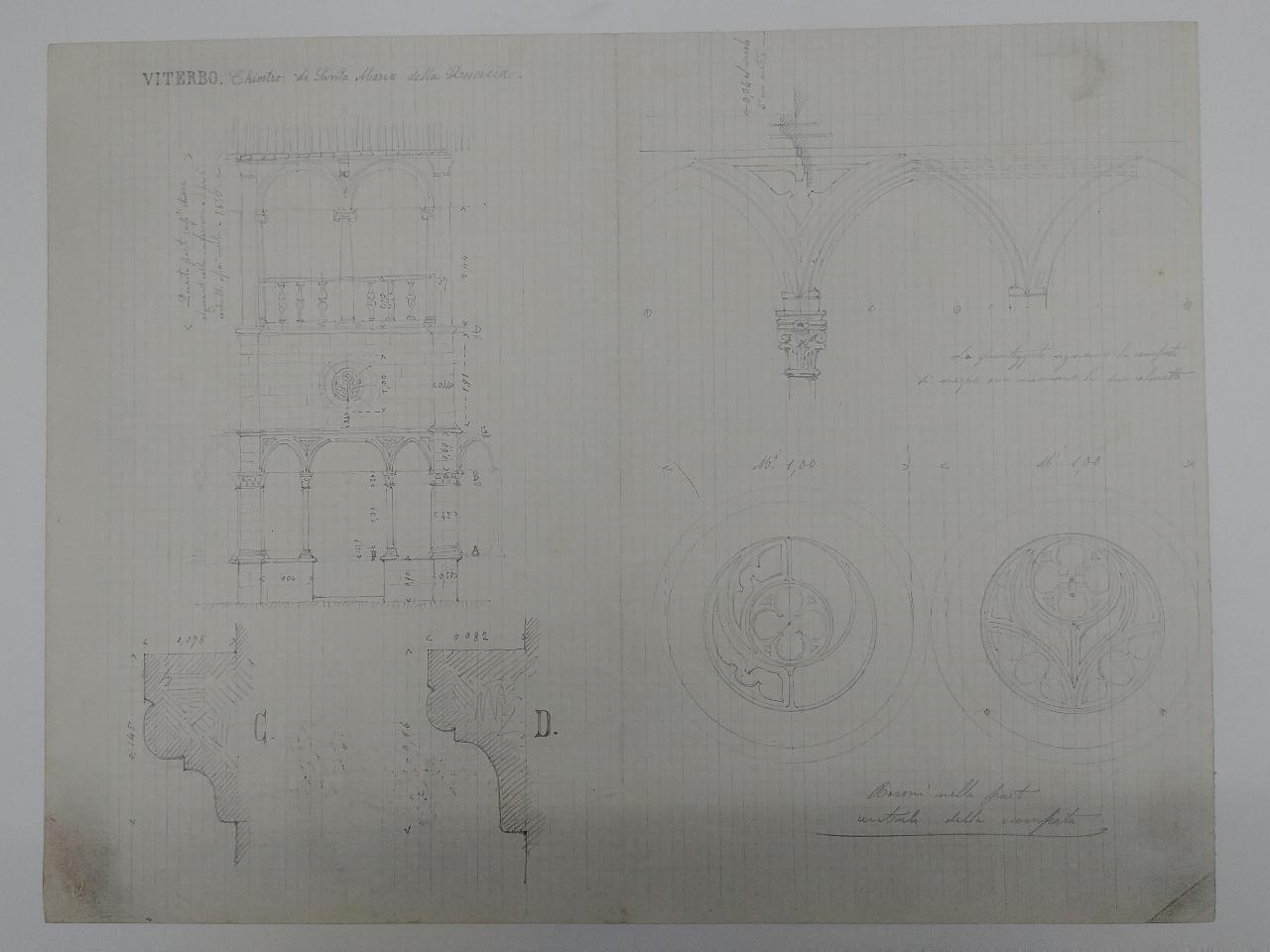 Serie di schizzi quotati a matita su foglio quadrettato chiaro.\nSin: particolare del prospetto frontale del chiostro, modanature dei pilastri\nDs: particolare delle arcate e dei capitelli, studi di due rosoni