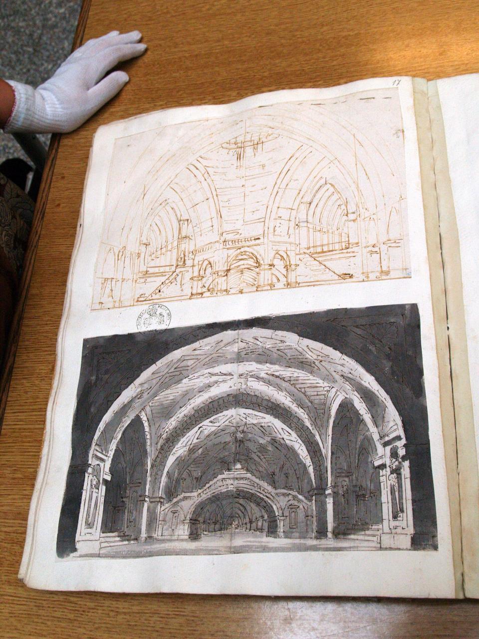 Sotterraneo con statue di divinità. Atrio di sotterraneo con galleria a prospettiva centrale, scale, nicchie per statue