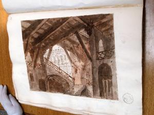 Interno di carcere. Interno di carcere: atrio con scala, soffitto con grosse travi