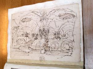 Sotterraneo con mostri e animali fantastici. Schizzo di sotterraneo articolato con statue di mostri e animali fantastici.
