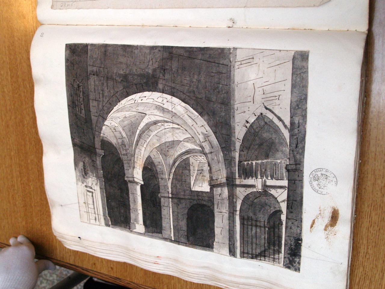 Interno di carcere chiuso da cancelli. Interno di carcere con grande arco a sinistra che inquadra colonne che sorreggono volte a crociera; cancelli, grate, accenni di gallerie
