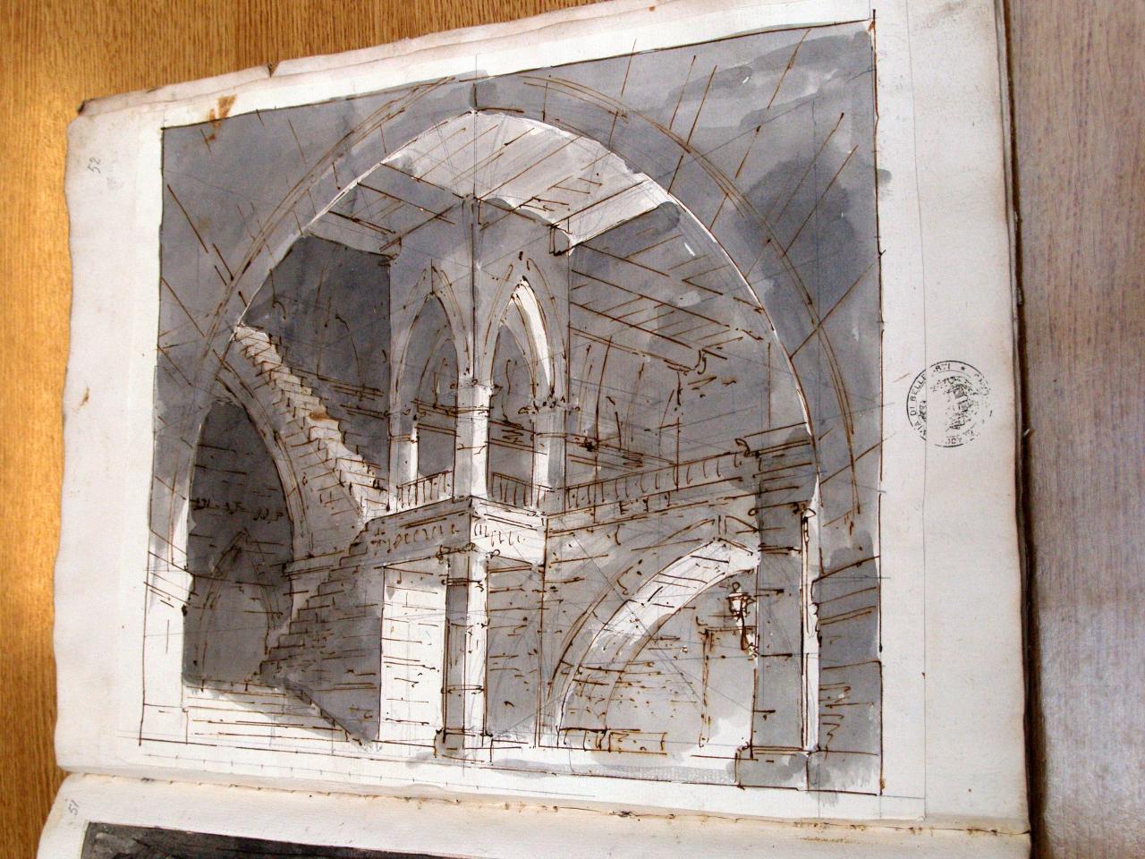 Carcere. Interno di carcere inquadrato da ampio arco; grossa scalea, archi a sesto acuto