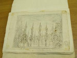 Sepolcro tra cipressi. Bosco di cipressi in cui si intravede grande sepolcro sulla sinistra