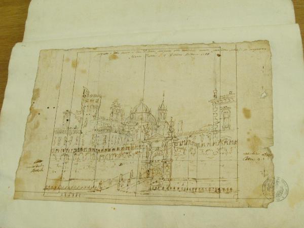 - NOTIZIE STORICO CRITICHE "Per la scena I, atto I, dell' 'Emira', Milano, 1756. " (Viale Ferrero 1963).\nIl disegno fa parte dell'album "K I 18" recante la scritta "N.9 Rovine Porti di Mare Città esterne Sepolcri e Camere rustiche d'Invenz. di Gio. Galliari in n.o 73". Come per l'album K I 17, questa scritta sembrerebbe successiva ai disegni. Viale Ferrero (1963) precisa che " l'indicazione 'Gio. Galliari' non è esatta; né se si riferisce a Giovanni Antonio perché si trovano molti disegni certo posteriori alla sua morte; né se si riferisce a Giovannino perché molti altri disegni sono datati in anni in cui egli era ancora bambino." Disegno esecutivo, reca in basso serie di numeri e lettere all'interno per la divisione del disegno fra i vari telari.