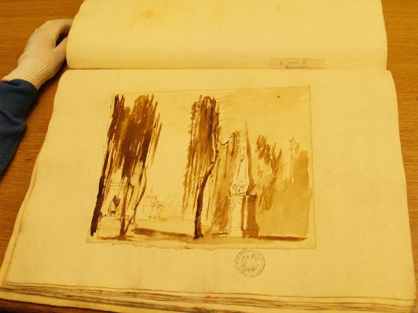 - NOTIZIE STORICO CRITICHE "Di mano di Bernardino." (Viale Ferrero 1963)\nIl disegno fa parte dell'album "K I 18" recante la scritta "N.9 Rovine Porti di Mare Città esterne Sepolcri e Camere rustiche d'Invenz. di Gio. Galliari in n.o 73". Come per l'album K I 17, questa scritta sembrerebbe successiva ai disegni. Viale Ferrero (1963) precisa che " l'indicazione 'Gio. Galliari' non è esatta; né se si riferisce a Giovanni Antonio perché si trovano molti disegni certo posteriori alla sua morte; né se si riferisce a Giovannino perché molti altri disegni sono datati in anni in cui egli era ancora bambino. Non identificata la destinazione.