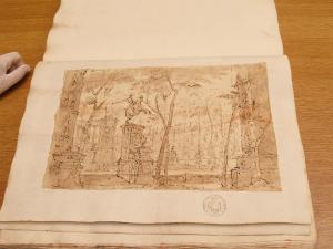 - NOTIZIE STORICO CRITICHE Riferendosi anche al DS 3362, Viale Ferrero (1963) fa notare: "I due disegni sono identici, solo uno è acquerellato, l'altro no." (Viale Ferrero 1963)\nIl disegno fa parte dell'album "K I 18" recante la scritta "N.9 Rovine Porti di Mare Città esterne Sepolcri e Camere rustiche d'Invenz. di Gio. Galliari in n.o 73". Come per l'album K I 17, questa scritta sembrerebbe successiva ai disegni. Viale Ferrero (1963) precisa che " l'indicazione 'Gio. Galliari' non è esatta; né se si riferisce a Giovanni Antonio perché si trovano molti disegni certo posteriori alla sua morte; né se si riferisce a Giovannino perché molti altri disegni sono datati in anni in cui egli era ancora bambino.Il disegno è simile al DS 3362, ma acquerellato. Disegno esecutivo: reca lettere all'interno per la divisione del disegno fra i vari telari.