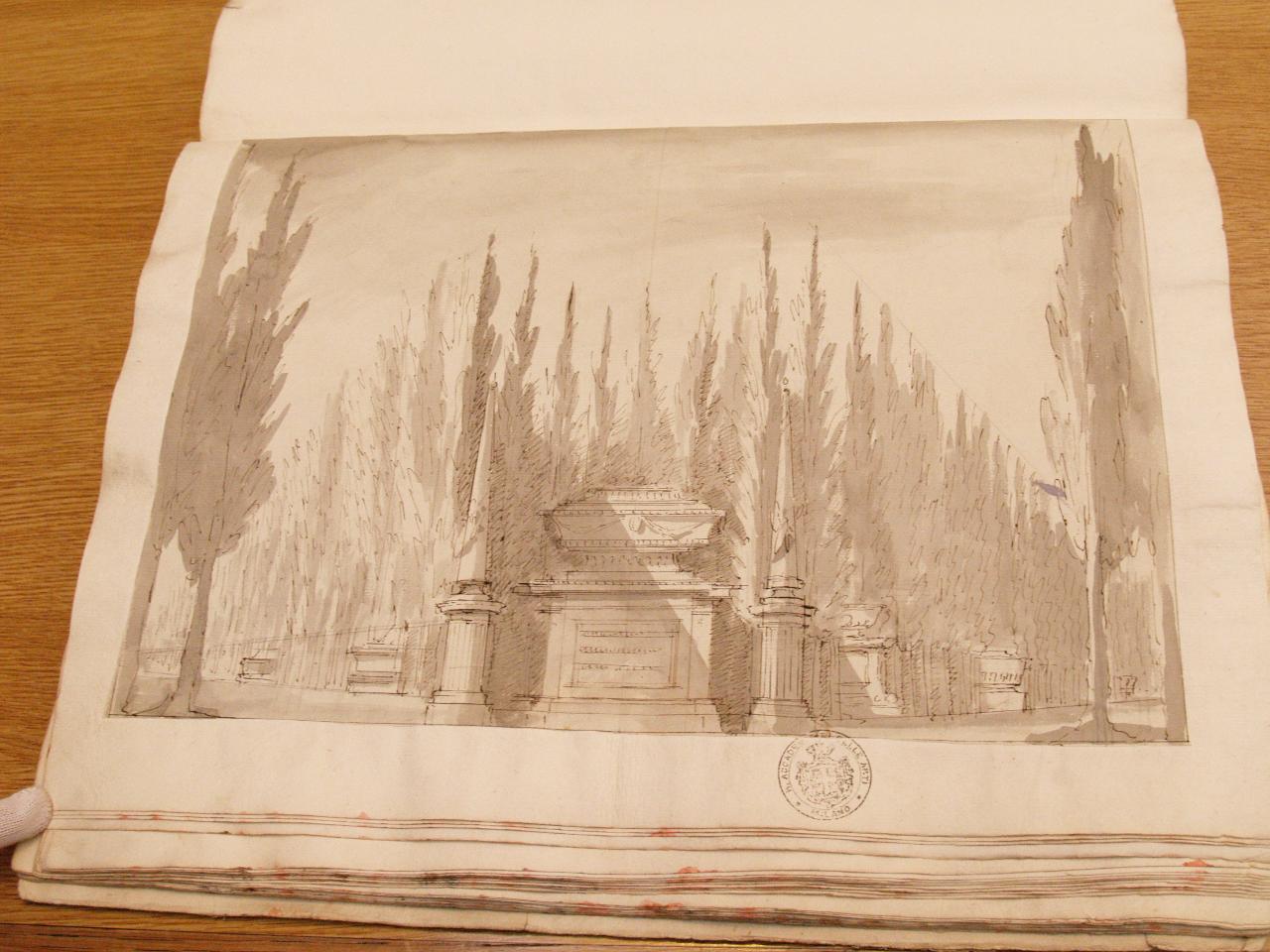 Sepolcri tra cipressi. Sepolcro monumentale fra obelischi in posizione centrale; dietro, sepolcri tra cipressi