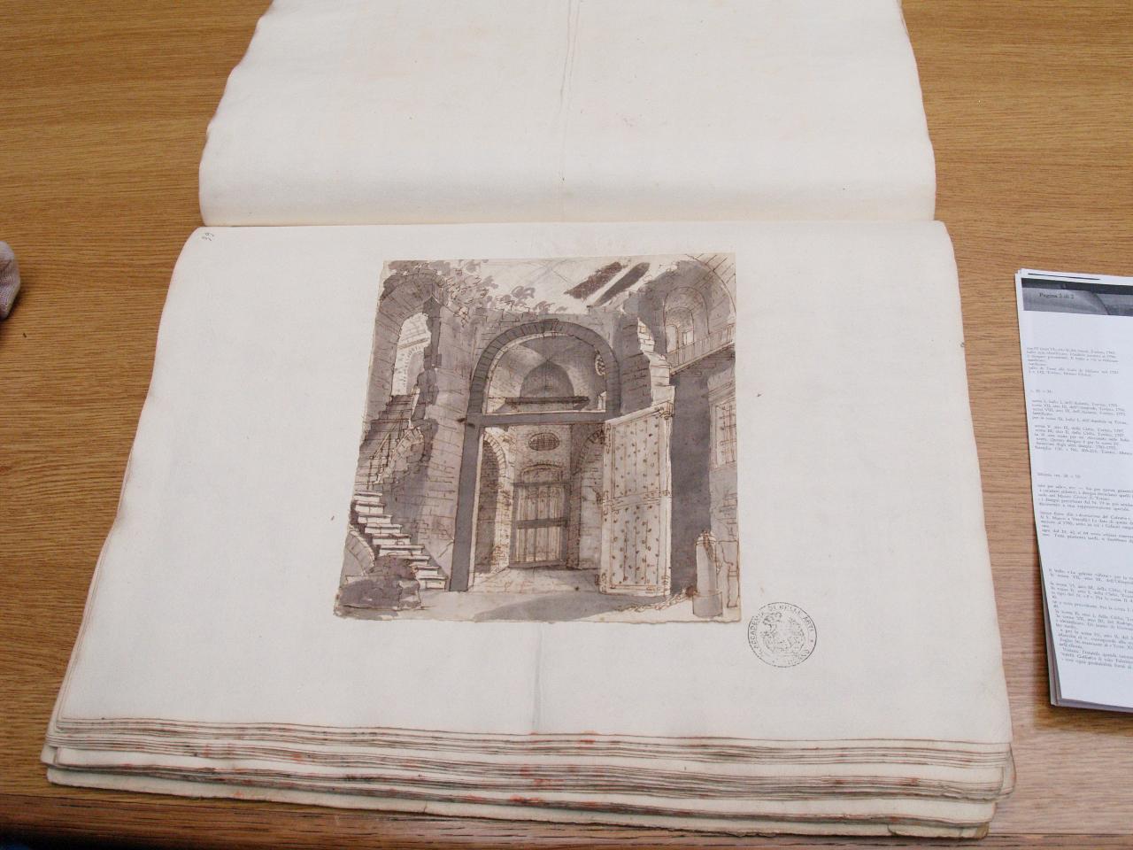 - NOTIZIE STORICO CRITICHE "Non identificato." (Viale Ferrero 1963)\nIl disegno fa parte dell'album "K I 18" recante la scritta "N.9 Rovine Porti di Mare Città esterne Sepolcri e Camere rustiche d'Invenz. di Gio. Galliari in n.o 73". Come per l'album K I 17, questa scritta sembrerebbe successiva ai disegni. Viale Ferrero (1963) precisa che " l'indicazione 'Gio. Galliari' non è esatta; né se si riferisce a Giovanni Antonio perché si trovano molti disegni certo posteriori alla sua morte; né se si riferisce a Giovannino perché molti altri disegni sono datati in anni in cui egli era ancora bambino. In Viale Ferrero (1963) questo disegno è definito "Porto": in realtà nessun elemento è riconducibile a questa tipologia; dovrebbe piuttosto far parte dell'album K I 17, recante la scritta "N.5 Prigioni e sotterranei d'Inven.e de' Fratelli Galliari". Disegno non identificato.