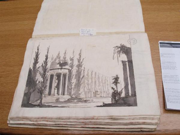 - NOTIZIE STORICO CRITICHE "Forse per la III scena del 'Lucio Silla',Torino, 1779." (Viale Ferrero 1963)\nIl disegno fa parte dell'album "K I 18" recante la scritta "N.9 Rovine Porti di Mare Città esterne Sepolcri e Camere rustiche d'Invenz. di Gio. Galliari in n.o 73". Come per l'album K I 17, questa scritta sembrerebbe successiva ai disegni. Viale Ferrero (1963) precisa che " l'indicazione 'Gio. Galliari' non è esatta; né se si riferisce a Giovanni Antonio perché si trovano molti disegni certo posteriori alla sua morte; né se si riferisce a Giovannino perché molti altri disegni sono datati in anni in cui egli era ancora bambino. Il disegno non è identificato: Viale Ferrero ipotizza sia per il 'Lucio Silla', Torino, 1779.