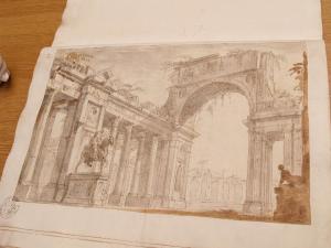 - NOTIZIE STORICO CRITICHE "Non identificato." (Viale Ferrero 1963)\nIl disegno fa parte dell'album "K I 18" recante la scritta "N.9 Rovine Porti di Mare Città esterne Sepolcri e Camere rustiche d'Invenz. di Gio. Galliari in n.o 73". Come per l'album K I 17, questa scritta sembrerebbe successiva ai disegni. Viale Ferrero (1963) precisa che " l'indicazione 'Gio. Galliari' non è esatta; né se si riferisce a Giovanni Antonio perché si trovano molti disegni certo posteriori alla sua morte; né se si riferisce a Giovannino perché molti altri disegni sono datati in anni in cui egli era ancora bambino. Il disegno non è identificato.