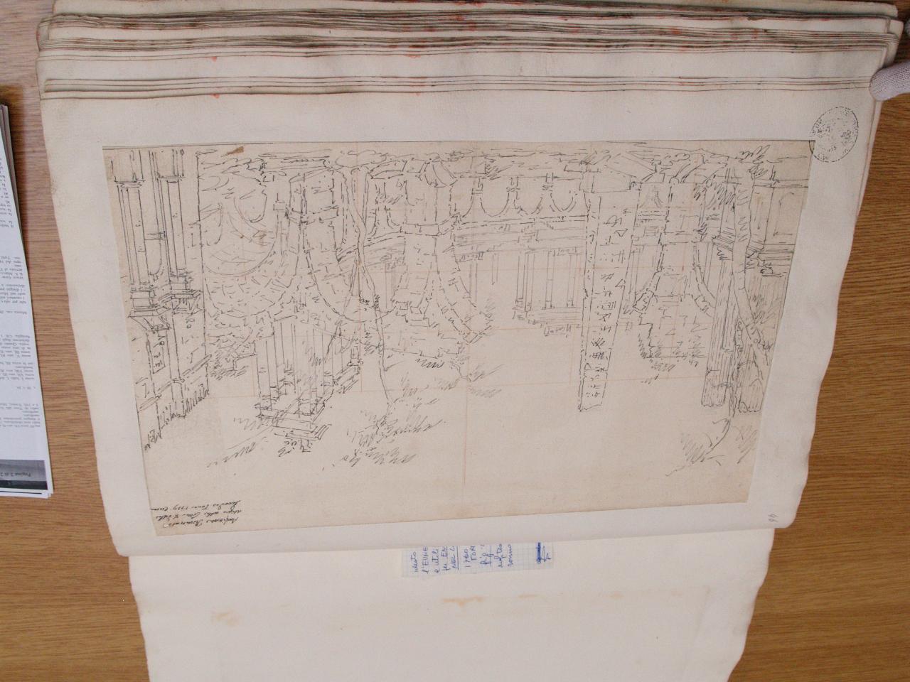 - NOTIZIE STORICO CRITICHE "Per la scena VIII, atto III, dell' 'Eumene', Torino, 1759. Cfr. N. 14, Album Pogliaghi." (Viale Ferrero 1963)\nIl disegno fa parte dell'album "K I 18" recante la scritta "N.9 Rovine Porti di Mare Città esterne Sepolcri e Camere rustiche d'Invenz. di Gio. Galliari in n.o 73". Come per l'album K I 17, questa scritta sembrerebbe successiva ai disegni. Viale Ferrero (1963) precisa che " l'indicazione 'Gio. Galliari' non è esatta; né se si riferisce a Giovanni Antonio perché si trovano molti disegni certo posteriori alla sua morte; né se si riferisce a Giovannino perché molti altri disegni sono datati in anni in cui egli era ancora bambino. Il disegno è pressoché uguale al n. 14 dell' Album Pogliaghi, "Rovine d' Antico Anphiteatro", realizzato per la scena VII, atto III, di 'Enea nel Lazio' (Torino, 1760). Presso la fondazione Pogliaghi di Varese non è attualmente rintracciabile l'album, ma il disegno in oggetto è riprodotto in Viale Ferrero 1963 (p. 151). Il disegno per 'Enea nel Lazio' è acquerellato.