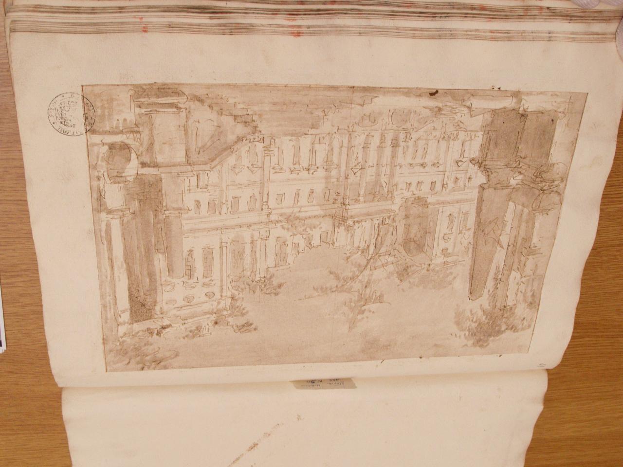 - NOTIZIE STORICO CRITICHE "Stesso tipo del N. 20. Vedere ivi." (Viale Ferrero 1963)\nIl disegno fa parte dell'album "K I 18" recante la scritta "N.9 Rovine Porti di Mare Città esterne Sepolcri e Camere rustiche d'Invenz. di Gio. Galliari in n.o 73". Come per l'album K I 17, questa scritta sembrerebbe successiva ai disegni. Viale Ferrero (1963) precisa che " l'indicazione 'Gio. Galliari' non è esatta; né se si riferisce a Giovanni Antonio perché si trovano molti disegni certo posteriori alla sua morte; né se si riferisce a Giovannino perché molti altri disegni sono datati in anni in cui egli era ancora bambino. Il disegno non è identificato. Viale Ferrero (1963) individua una somiglianza con il DS 3359, databile intorno agli anni 1760-1763.
