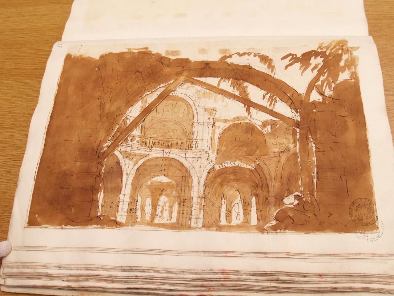 - NOTIZIE STORICO CRITICHE "Non identificato." (Viale Ferrero 1963)\nIl disegno fa parte dell'album "K I 18" recante la scritta "N.9 Rovine Porti di Mare Città esterne Sepolcri e Camere rustiche d'Invenz. di Gio. Galliari in n.o 73". Come per l'album K I 17, questa scritta sembrerebbe successiva ai disegni. Viale Ferrero (1963) precisa che " l'indicazione 'Gio. Galliari' non è esatta; né se si riferisce a Giovanni Antonio perché si trovano molti disegni certo posteriori alla sua morte; né se si riferisce a Giovannino perché molti altri disegni sono datati in anni in cui egli era ancora bambino. Il disegno non è identificato. Risulta dalla sovrapposizione di due fogli: il primo, ritagliato, reca il principale con l'arco, l'albero e le strutture sulla destra. Il disegno reca lettere e numeri per la disposizione fra i vari telari e la specifica delle altezze.