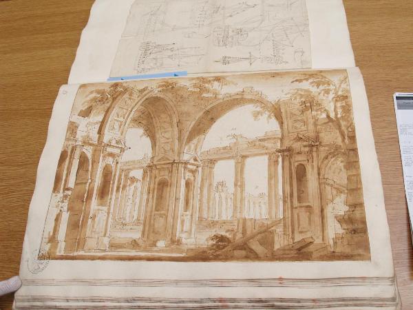 - NOTIZIE STORICO CRITICHE "I disegni non sono identificati." (Viale Ferrero 1963)\nIl disegno fa parte dell'album "K I 18" recante la scritta "N.9 Rovine Porti di Mare Città esterne Sepolcri e Camere rustiche d'Invenz. di Gio. Galliari in n.o 73". Come per l'album K I 17, questa scritta sembrerebbe successiva ai disegni. Viale Ferrero (1963) precisa che " l'indicazione 'Gio. Galliari' non è esatta; né se si riferisce a Giovanni Antonio perché si trovano molti disegni certo posteriori alla sua morte; né se si riferisce a Giovannino perché molti altri disegni sono datati in anni in cui egli era ancora bambino. Disegno esecutivo: reca indicazioni di lettere e numeri per la divisione sui vari telari.