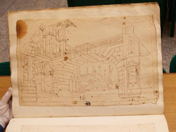 Portico con veduta di navi in un porto.. Ampio arco o ponte da cui si scorge porto di mare; a destra grande lapide e fontana con mascherone