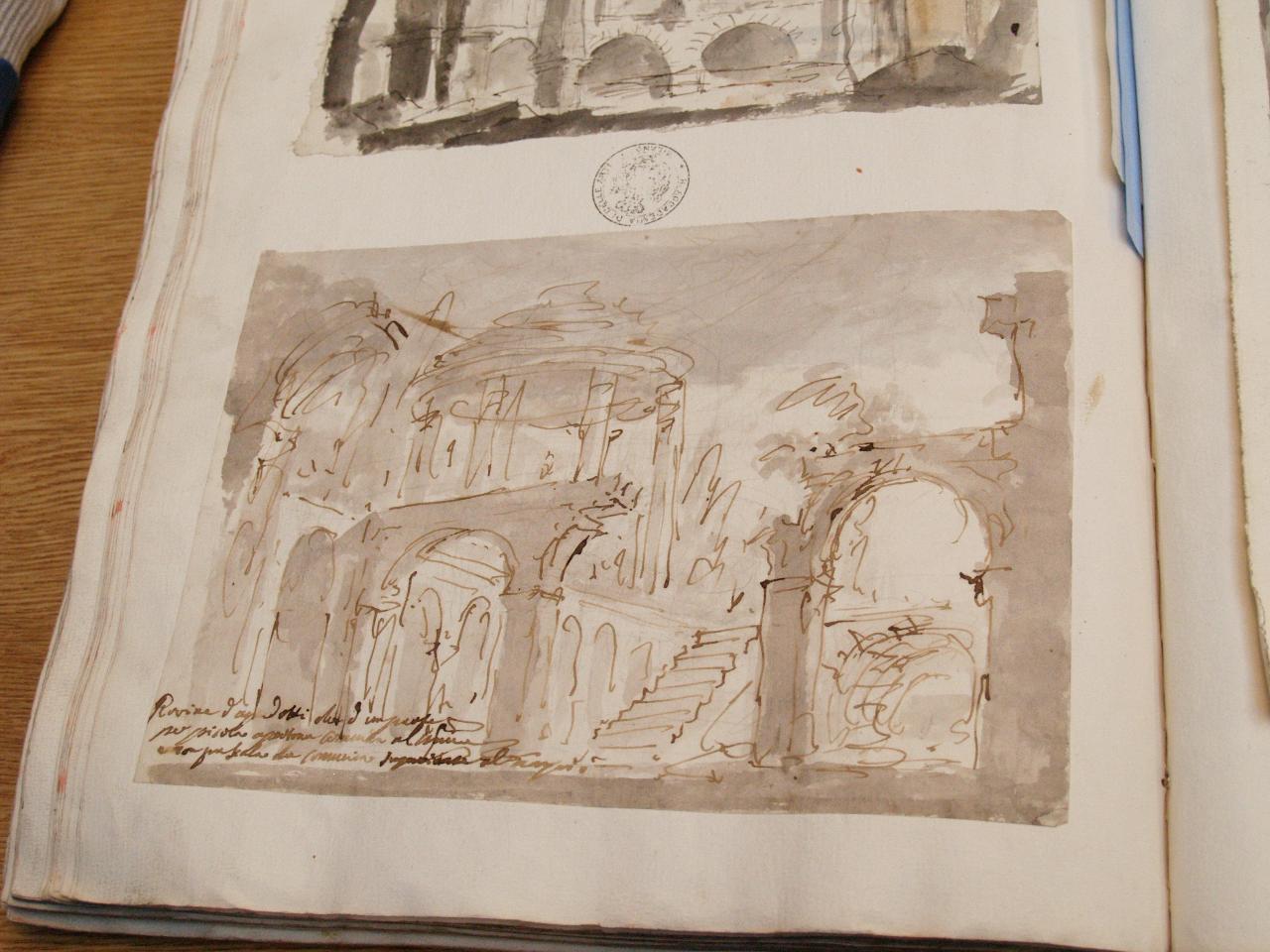 - NOTIZIE STORICO CRITICHE "Il II disegno è per la scena IX, atto III, del 'Sicotencal' (Torino, 1776), come da confronto coi Nn. 16 e 20 album '57', Bologna, Pinacoteca, che sono per la stessa scena." (Viale Ferrero 1963)\nIl disegno fa parte dell'album "K I 18" recante la scritta "N.9 Rovine Porti di Mare Città esterne Sepolcri e Camere rustiche d'Invenz. di Gio. Galliari in n.o 73". Come per l'album K I 17, questa scritta sembrerebbe successiva ai disegni. Viale Ferrero (1963) precisa che " l'indicazione 'Gio. Galliari' non è esatta; né se si riferisce a Giovanni Antonio perché si trovano molti disegni certo posteriori alla sua morte; né se si riferisce a Giovannino perché molti altri disegni sono datati in anni in cui egli era ancora bambino.