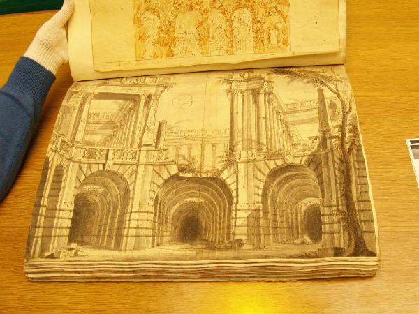 - NOTIZIE STORICO CRITICHE "Da questo disegno venne tratta un'incisione, con aggiunte le figure di Teseo e del Minotauro. Si riferisce all' 'Arianna', Milano, 1762. Cfr. Album Pogliaghi, N. 68." (Viale Ferrero 1963)\nIl disegno fa parte dell'album "K I 18" recante la scritta "N.9 Rovine Porti di Mare Città esterne Sepolcri e Camere rustiche d'Invenz. di Gio. Galliari in n.o 73". Come per l'album K I 17, questa scritta sembrerebbe successiva ai disegni. Viale Ferrero (1963) precisa che " l'indicazione 'Gio. Galliari' non è esatta; né se si riferisce a Giovanni Antonio perché si trovano molti disegni certo posteriori alla sua morte; né se si riferisce a Giovannino perché molti altri disegni sono datati in anni in cui egli era ancora bambino.Disegno preparatorio per l'acquaforte di Marc'Antonio Dal Re, Certamen Thesei contra Minotaurum / Inter theatralia Mediolani Spectacula / Viriliter expressum / A Manzolio / In Scenicis et Musicis Facultatibus / Ante Omnes praestabili (1762). Il disegno è incollato su foglio non numerato; Viale Ferrero (1963) gli attribuisce il numero 65, segnalando mancante il 64. Si è qui preferito segnalarlo come 64/65, giacché col numero 65 è numerato il foglio successivo.