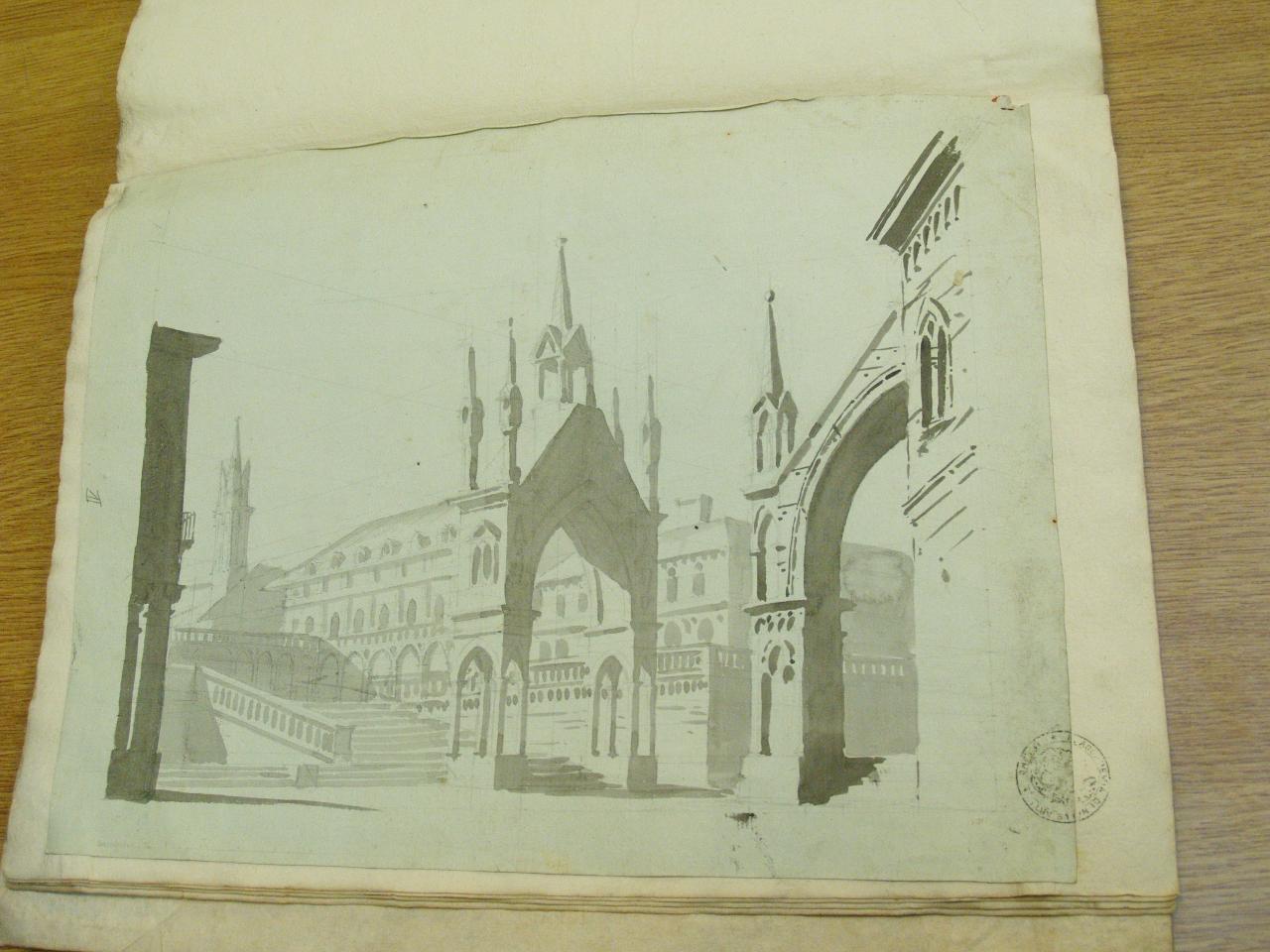 - NOTIZIE STORICO CRITICHE "Di mano di Gaspare." (Viale Ferrero 1963)\nIl disegno fa parte dell'album "K I 18" recante la scritta "N.10 Decorazioni Gotiche d'Invenzione di Gio. Galliari in n. 29". Come per l'album K I 17 e K I 18, questa scritta sembrerebbe successiva ai disegni. Viale Ferrero (1963) precisa che " l'indicazione 'Gio. Galliari' non è esatta; né se si riferisce a Giovanni Antonio perché si trovano molti disegni certo posteriori alla sua morte; né se si riferisce a Giovannino perché molti altri disegni sono datati in anni in cui egli era ancora bambino. A differenza degli album K I 17 e K I 18, i fogli del K I 19 recano la numerazione romana. L'album ha partecipato a "Mostra del barocco piemontese", Torino 1963: l'Accademia conserva documentazione precedentemente allegata all'album. Il disegno è uguale al DS 3423 nel soggetto, ma si differenzia per un'esecuzione più accurata.