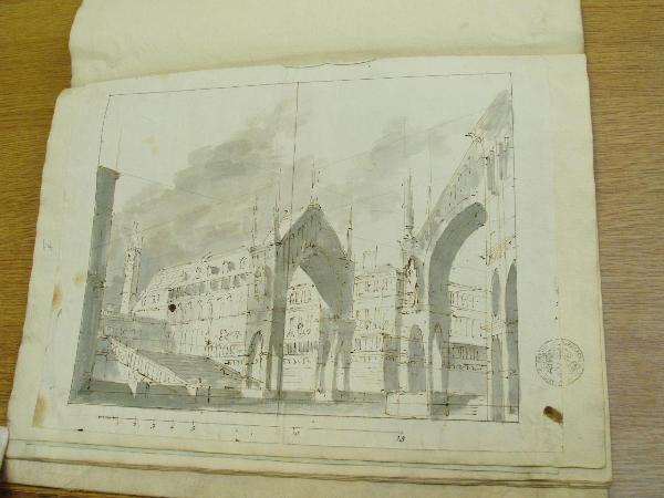 - NOTIZIE STORICO CRITICHE "Di mano di Gaspare." (Viale Ferrero 1963)\nIl disegno fa parte dell'album "K I 18" recante la scritta "N.10 Decorazioni Gotiche d'Invenzione di Gio. Galliari in n. 29." Come per l'album K I 17 e K I 18, questa scritta sembrerebbe successiva ai disegni. Viale Ferrero (1963) precisa che " l'indicazione 'Gio. Galliari' non è esatta; né se si riferisce a Giovanni Antonio perché si trovano molti disegni certo posteriori alla sua morte; né se si riferisce a Giovannino perché molti altri disegni sono datati in anni in cui egli era ancora bambino. A differenza degli album K I 17 e K I 18, i fogli del K I 19 recano la numerazione romana. L'album ha partecipato a "Mostra del barocco piemontese", Torino 1963: l'Accademia conserva documentazione precedentemente allegata all'album. Il disegno reca in basso una scala grafica per la riduzione; è uguale al DS 3422. Il DS 3423 propone uno schizzo meno preciso, più operativo.