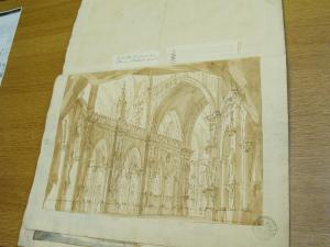 - NOTIZIE STORICO CRITICHE "Si direbbe di mano di Fabrizio. Abbastanza primitivo." (Viale Ferrero 1963)\nIl disegno fa parte dell'album "K I 18" recante la scritta "N.10 Decorazioni Gotiche d'Invenzione di Gio. Galliari in n. 29". Come per l'album K I 17 e K I 18, questa scritta sembrerebbe successiva ai disegni. Viale Ferrero (1963) precisa che " l'indicazione 'Gio. Galliari' non è esatta; né se si riferisce a Giovanni Antonio perché si trovano molti disegni certo posteriori alla sua morte; né se si riferisce a Giovannino perché molti altri disegni sono datati in anni in cui egli era ancora bambino. A differenza degli album K I 17 e K I 18, i fogli del K I 19 recano la numerazione romana. L'album ha partecipato a "Mostra del barocco piemontese", Torino 1963: l'Accademia conserva documentazione precedentemente allegata all'album. Il disegno non è identificato: Viale Ferrero ipotizza sia di mano di Fabrizio.