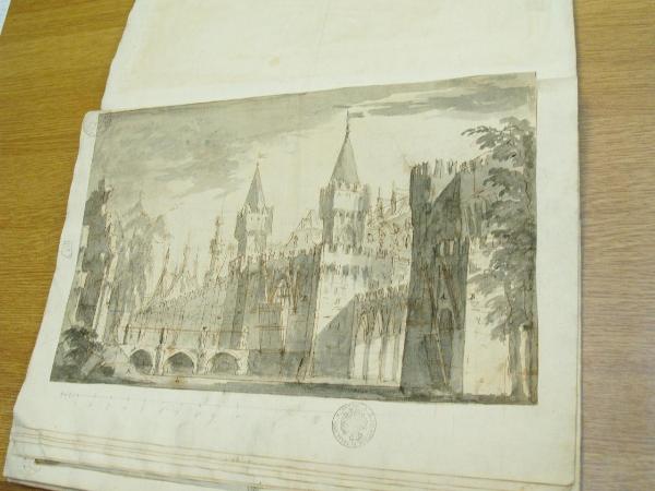 - NOTIZIE STORICO CRITICHE "Non identificato." (Viale Ferrero 1963)\nIl disegno fa parte dell'album "K I 18" recante la scritta "N.10 Decorazioni Gotiche d'Invenzione di Gio. Galliari in n. 29". Come per l'album K I 17 e K I 18, questa scritta sembrerebbe successiva ai disegni. Viale Ferrero (1963) precisa che " l'indicazione 'Gio. Galliari' non è esatta; né se si riferisce a Giovanni Antonio perché si trovano molti disegni certo posteriori alla sua morte; né se si riferisce a Giovannino perché molti altri disegni sono datati in anni in cui egli era ancora bambino. A differenza degli album K I 17 e K I 18, i fogli del K I 19 recano la numerazione romana. L'album ha partecipato a "Mostra del barocco piemontese", Torino 1963: l'Accademia conserva documentazione precedentemente allegata all'album. Il disegno non è identificato; reca scala grafica e lettere per la divisione del disegno fra i vari telari. La composizione, la distribuzione fra i telari e il tratto suggerirebbero un'attribuzione a Fabrizio Galliari.