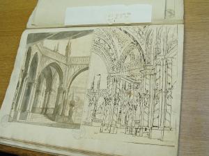 - NOTIZIE STORICO CRITICHE Confrontando i due disegni al foglio 27 Viale Ferrero afferma: "Il II disegno, non identificato, è d'altra mano." (Viale Ferrero 1963)\nIl disegno fa parte dell'album "K I 18" recante la scritta "N.10 Decorazioni Gotiche d'Invenzione di Gio. Galliari in n. 29". Come per l'album K I 17 e K I 18, questa scritta sembrerebbe successiva ai disegni. Viale Ferrero (1963) precisa che " l'indicazione 'Gio. Galliari' non è esatta; né se si riferisce a Giovanni Antonio perché si trovano molti disegni certo posteriori alla sua morte; né se si riferisce a Giovannino perché molti altri disegni sono datati in anni in cui egli era ancora bambino. A differenza degli album K I 17 e K I 18, i fogli del K I 19 recano la numerazione romana. L'album ha partecipato a "Mostra del barocco piemontese", Torino 1963: l'Accademia conserva documentazione precedentemente allegata all'album. Il disegno non è identificato; reca indicazione di lettere enumeri per la disposizione sui vari telari.
