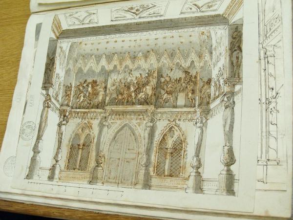 - NOTIZIE STORICO CRITICHE "Di Gaspare." (Viale Ferrero 1963)\nIl disegno fa parte dell'album "K I 18" recante la scritta "N.10 Decorazioni Gotiche d'Invenzione di Gio. Galliari in n. 29". Come per l'album K I 17 e K I 18, questa scritta sembrerebbe successiva ai disegni. Viale Ferrero (1963) precisa che " l'indicazione 'Gio. Galliari' non è esatta; né se si riferisce a Giovanni Antonio perché si trovano molti disegni certo posteriori alla sua morte; né se si riferisce a Giovannino perché molti altri disegni sono datati in anni in cui egli era ancora bambino. A differenza degli album K I 17 e K I 18, i fogli del K I 19 recano la numerazione romana. L'album ha partecipato a "Mostra del barocco piemontese", Torino 1963: l'Accademia conserva documentazione precedentemente allegata all'album. Il disegno non è identificato; reca scala grafica sotto il disegno.