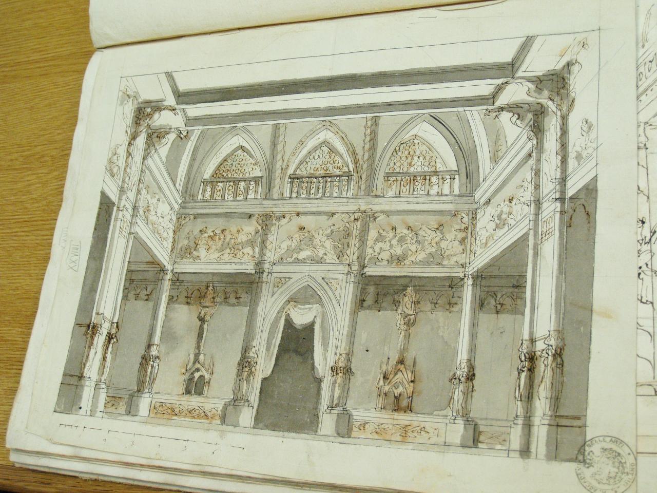 - NOTIZIE STORICO CRITICHE "Di Gaspare." (Viale Ferrero 1963)\nIl disegno fa parte dell'album "K I 18" recante la scritta "N.10 Decorazioni Gotiche d'Invenzione di Gio. Galliari in n. 29". Come per l'album K I 17 e K I 18, questa scritta sembrerebbe successiva ai disegni. Viale Ferrero (1963) precisa che " l'indicazione 'Gio. Galliari' non è esatta; né se si riferisce a Giovanni Antonio perché si trovano molti disegni certo posteriori alla sua morte; né se si riferisce a Giovannino perché molti altri disegni sono datati in anni in cui egli era ancora bambino. A differenza degli album K I 17 e K I 18, i fogli del K I 19 recano la numerazione romana. L'album ha partecipato a "Mostra del barocco piemontese", Torino 1963: l'Accademia conserva documentazione precedentemente allegata all'album. Il disegno non è identificato; reca scala grafica sotto il disegno.