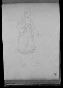 - NOTIZIE STORICO CRITICHE Sull'abito si riconosce il simbolo dei Visconti. E' possibile che questo disegno sia stato eseguito in occasione della realizzazione di quadri nei quali sono protagonisti membri della famiglia Visconti, ovvero La congiura dei Lampugnani (o di Cola Montano), databile tra il 1826 e il 1829, e Filippo Maria Visconti Duca di Milano restituisce le corone ai re di Aragona e di Navarra, dipinto tra il 1824 e il 1829. Lo studio di costume può essere servito come documentazione storica, sebbene non sia stato utilizzato direttamente per la stesura delle opere citate. (M. Tavola)