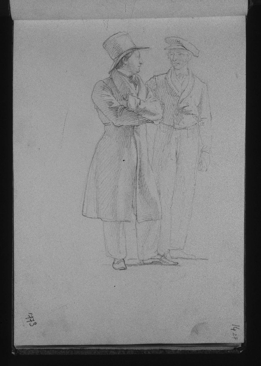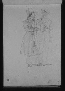 - NOTIZIE STORICO CRITICHE Schizzo dal vero degli amici artisti Molteni, raffigurato con cilindro, e Migliara con un berretto da pittore. Questo foglio si può considerare come una sorta di appunto preparatorio per l'Autoritratto con Giuseppe Molteni, Tommaso Grossi, Giovanni Migliara e Pelagio Palagi del 1827, conservato a Milano al Museo Poldi Pezzoli. (M. Tavola)