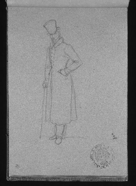 - NOTIZIE STORICO CRITICHE Il personaggio raffigurato ricorda le fattezze di Francesco Cicognara, effigiato nel Ritratto di gruppo della famiglia Cicognara, con il busto colossale di Antonio Canova, eseguito tra il 1816 e il 1817. Non è possibile identificare con certezza l'identità dell'uomo, ma si deve tenere presente che in questo taccuino sono presenti anche due studi relativi a Lucia Fantinati, seconda moglie di Leopoldo Cicognara, ritratta nello stesso dipinto. (M. Tavola)