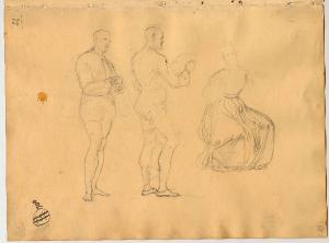 Gruppo di figure (uomini all'impiedi e donna seduta). figure maschili e figure femminili