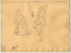 Donna orante e gentiluomo con studio di mani. figura maschile, figura femminile e studio di mano