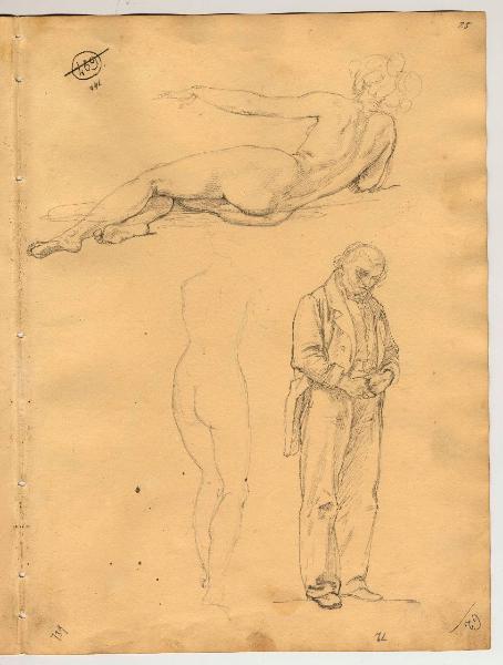 Nuda distesa, figura d'uomo vestito all'impiedi, schizzo di nuda. nudi femminili e figura maschile