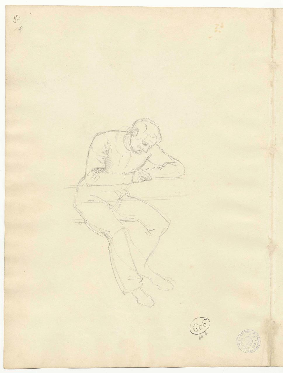 Schizzo d'uomo seduto che disegna. figura maschile seduta