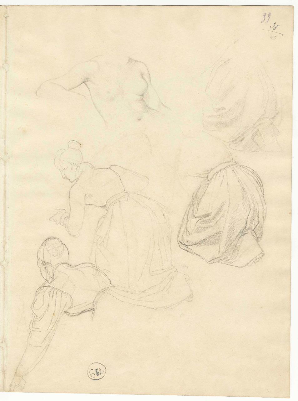 Torso femminile, panneggi e figure inginocchiate. figura femminile, nudo femminile e panneggio