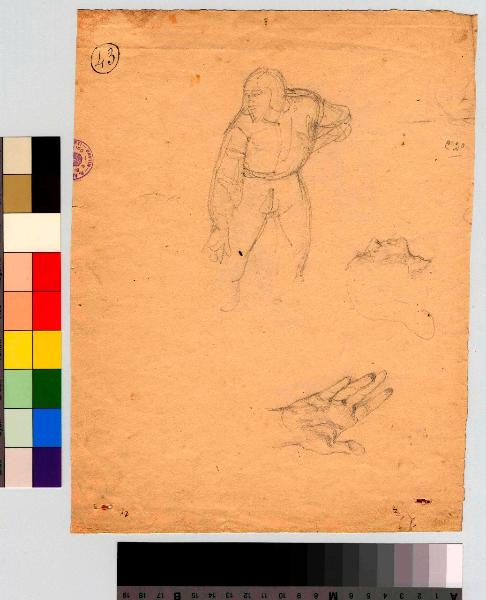 Uomo in costume di schermitore. Una testa vista di profilo; mano/ Studio di mani che si stringono. figura maschile, testa, mani