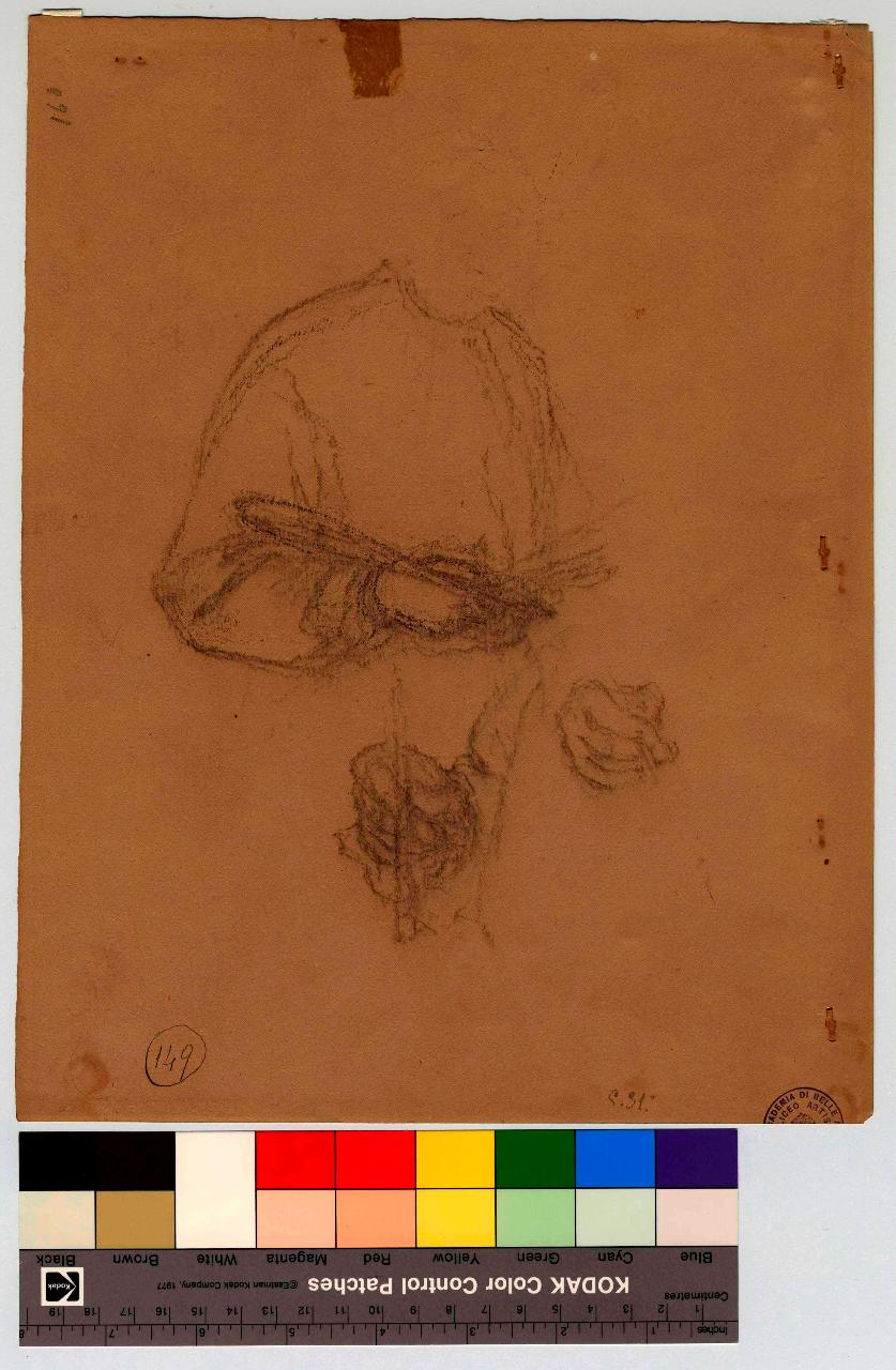 Studi per l'autoritratto e studi di mano con pennello. figura maschile, mani