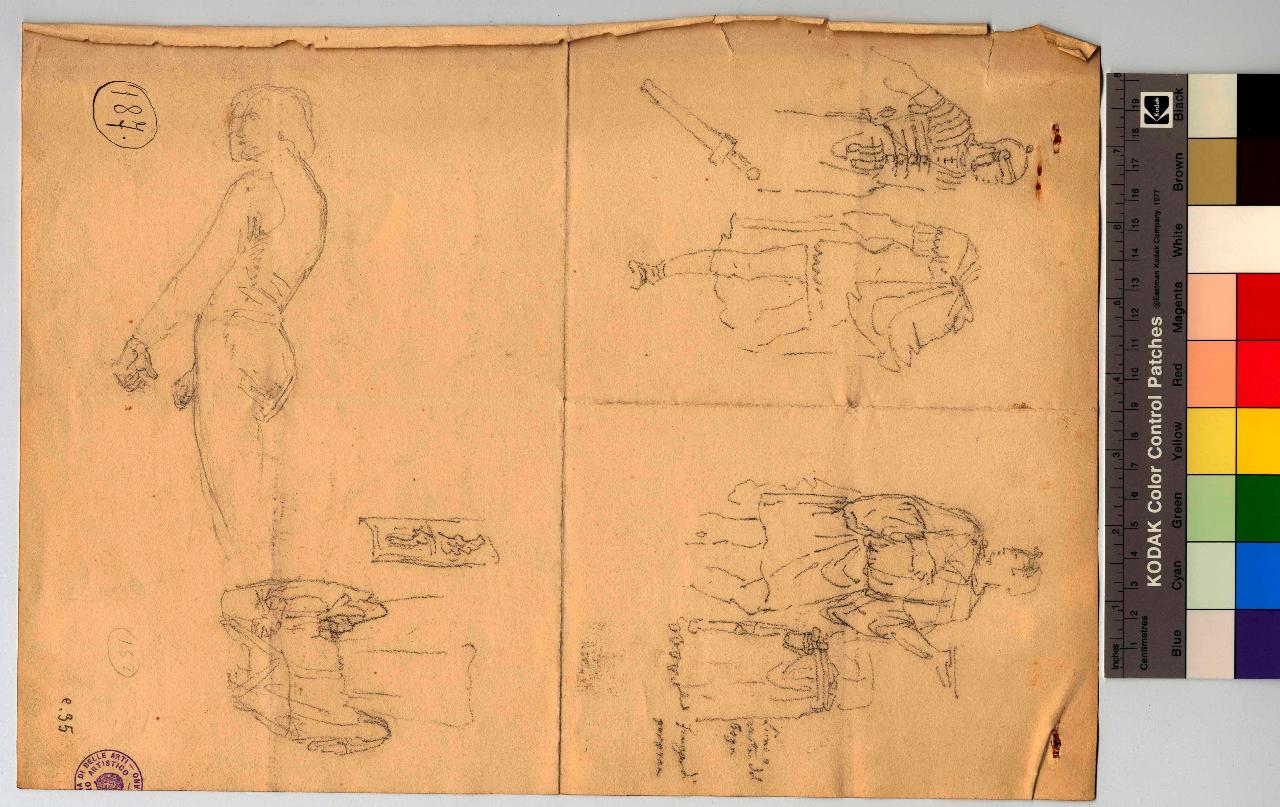 Studi di costumi di romani antichi (soldati civili). Figura d'uomo vista di lato. soldati, guerrieri, romani, figura maschile