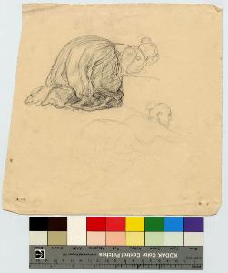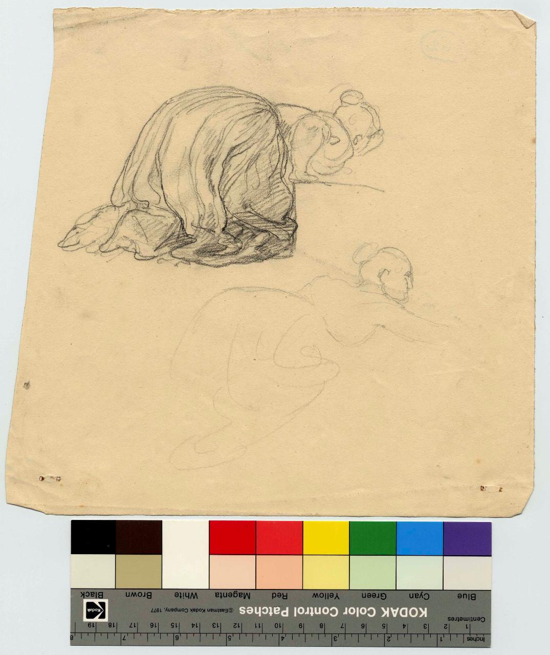 Due studi dello stesso soggetto: Donna bocconi che cerca qualcosa per terra per la "Sete dei Crociati". figura femminile inginocchiata, Sete dei Crociati