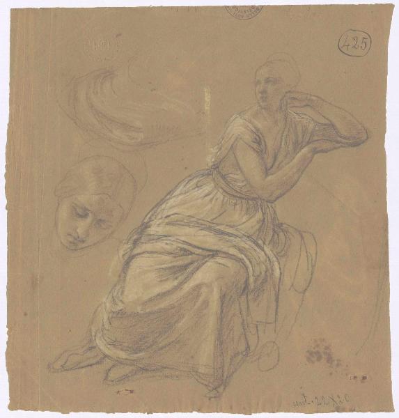 Figura femminile seduta e schizzo di testa/ Figura femminile seduta e studi di mani e teste. figura femminile e testa | figura femminile, mani e teste