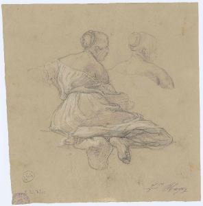 Donna a terra vista di schiena. Schizzo della stessa. figura femminile di schiena