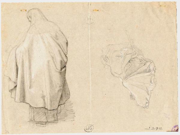 Studio di scena orientale. Donna vista di dorso ravvolta in mantello. Altra seminuda seduta. figure femminili